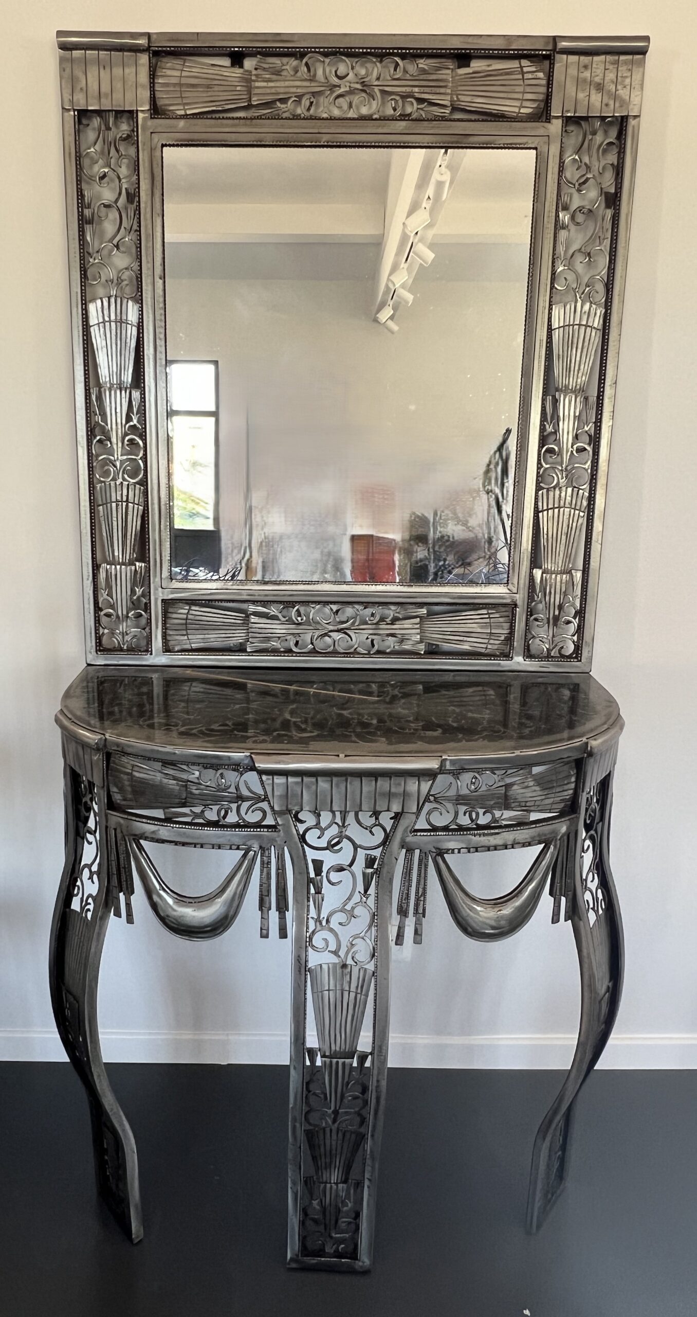 Console avec glace – métal brossé, style rétro revisité Élégante console murale en métal brossé, accompagnée de sa glace assortie. Design rétro chic, lignes pures, finitions artisanales. Une pièce intemporelle qui allie raffinement et modernité.